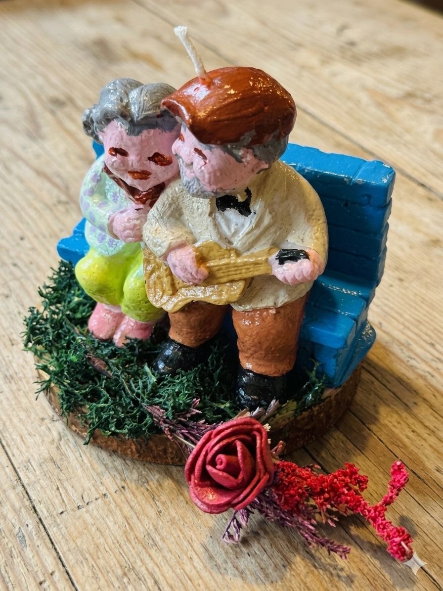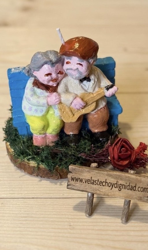 Esta delicada vela artesanal no es solo un objeto decorativo, es una pequeña historia llena de ternura y significado. Representa a dos abuelitos sentados en un banco, compartiendo un momento de calma, cariño y complicidad. Cada detalle ha sido cuidadosamente modelado y pintado a mano, haciendo de cada pieza algo único e irrepetible.